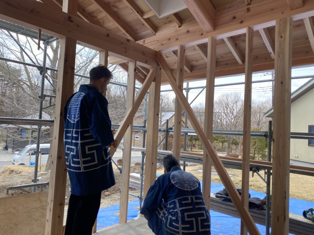 こちらは3月に建方した那須の現場の上棟式「四方固め」の一幕。
